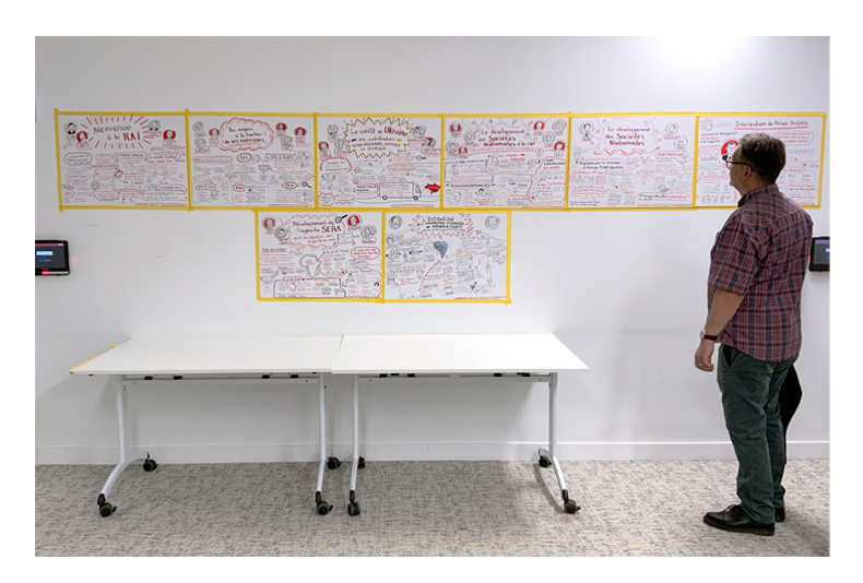 Toutes les fresques ont été réalisées surplace durant les quatres jours du rassemblement, affichées dans la salle de repos pour que chacun puisse se remémorer les points abordés au fur et à mesure des tables rondes, puis numérisées er redessinées pour accompagner le compte-rendu de l'évènement.