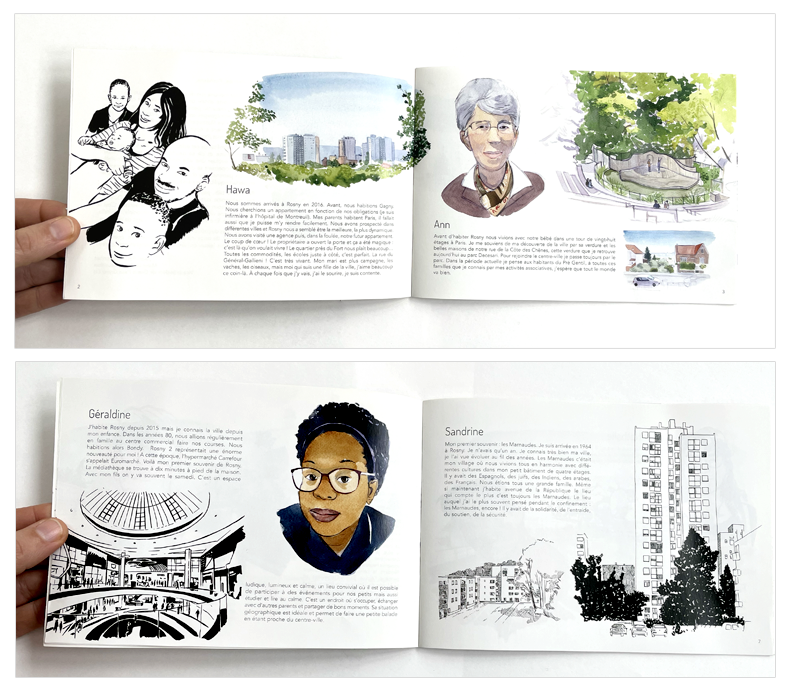 Pour ce projet, je suis venu surplace à plusieurs reprises pour réaliser des peintures. Comme nous étions en pleine perode d’épidémie de Covid, les portraits ont été peints d’après des photos réalisés par les habitants. J’ai également réalisé la mise en page du livre final et les panneaux de l’exposition.