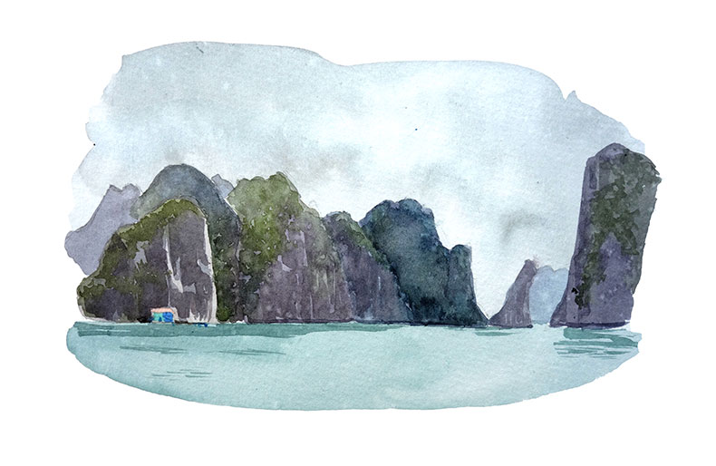 Le spectacle aux alentours de Cat Ba est magnifique : de grandes îles de roches calcaire, couvertes de végétation, forment un paysage sans cesse changeant. Les pêcheurs vivent dans des petites maisons flottantes turquoises éparpillées ça et là. Le ciel est gris, les rochers sont sombres, la surface de l'eau est pâle,