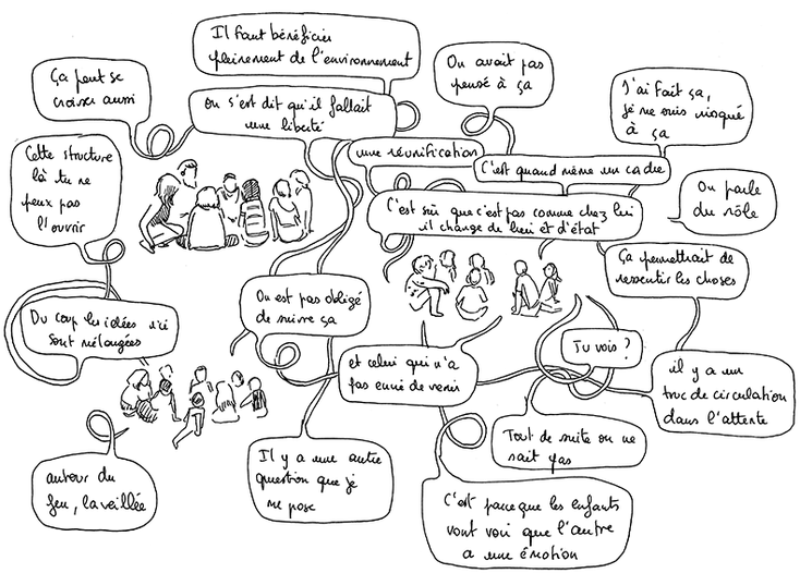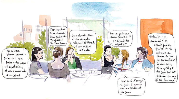 Voici quelques extraits d'un reportage graphiques en techniques traditionnelles (encre et aquarelles) réalisé pour le Réseau interprofessionnel des musiques jeunes public et le Ministère de la culture. Le contexte : réunir des professionnels du monde du spectacle et de la jeunesse pour imaginer des formes de spectacles vivants mêlant musique et art numérique. Durant trois jours, j'assiste aux échanges, aux réunions, aux rencontres et aux premiers prototypes des spectacles imaginés.